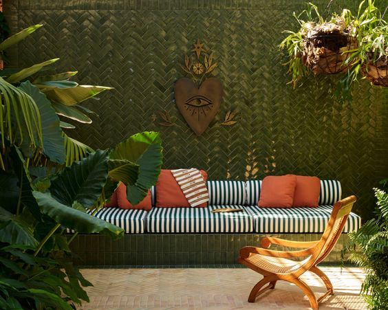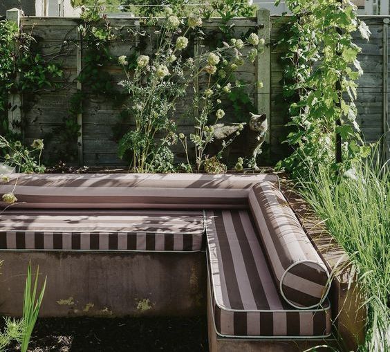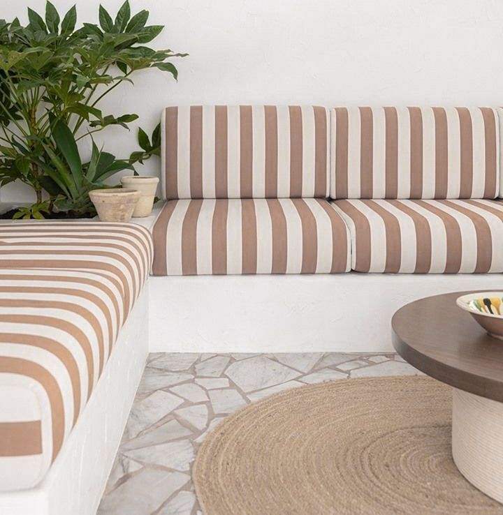 Сейчас мы уже готовы похвастаться большим спектром работ в наших материалах: подушки для садовой мебели и лежаков, качели, беседки, портьеры на террасах, оформление пляжных зон и зон у бассейна, а также многое другое.