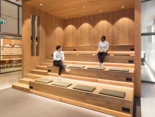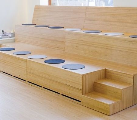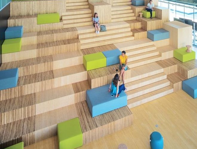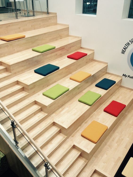 Все больше общественных пространств, в мире оформляется по принципу колизея: ступени, на которых можно присесть, и при этом остается место для прохода. Так выглядят аудитории, классы, различные залы и даже места ожидания, где необходимо сэкономить место и есть возможность подъема на другой этаж.