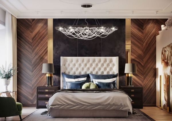 Вот мы и подошли к вопросу освещения. Не секрет, что единственного источника освещения в комнате недостаточно. Это касается всех помещений в доме в т.ч. и спальни. Как уже упоминалось выше, включить и выключить свет должно быть удобно, не вставая с постели, но сколько источников света стоит задействовать? Ответ прост – не меньше двух. Основное освещение (потолочное) и прикроватное освещение. Чаще всего этого достаточно. Игры со спотами в потолке на большого любителя, так как они могут создать приглушенное освещение и часто бьют в глаза лежащему на кровати.